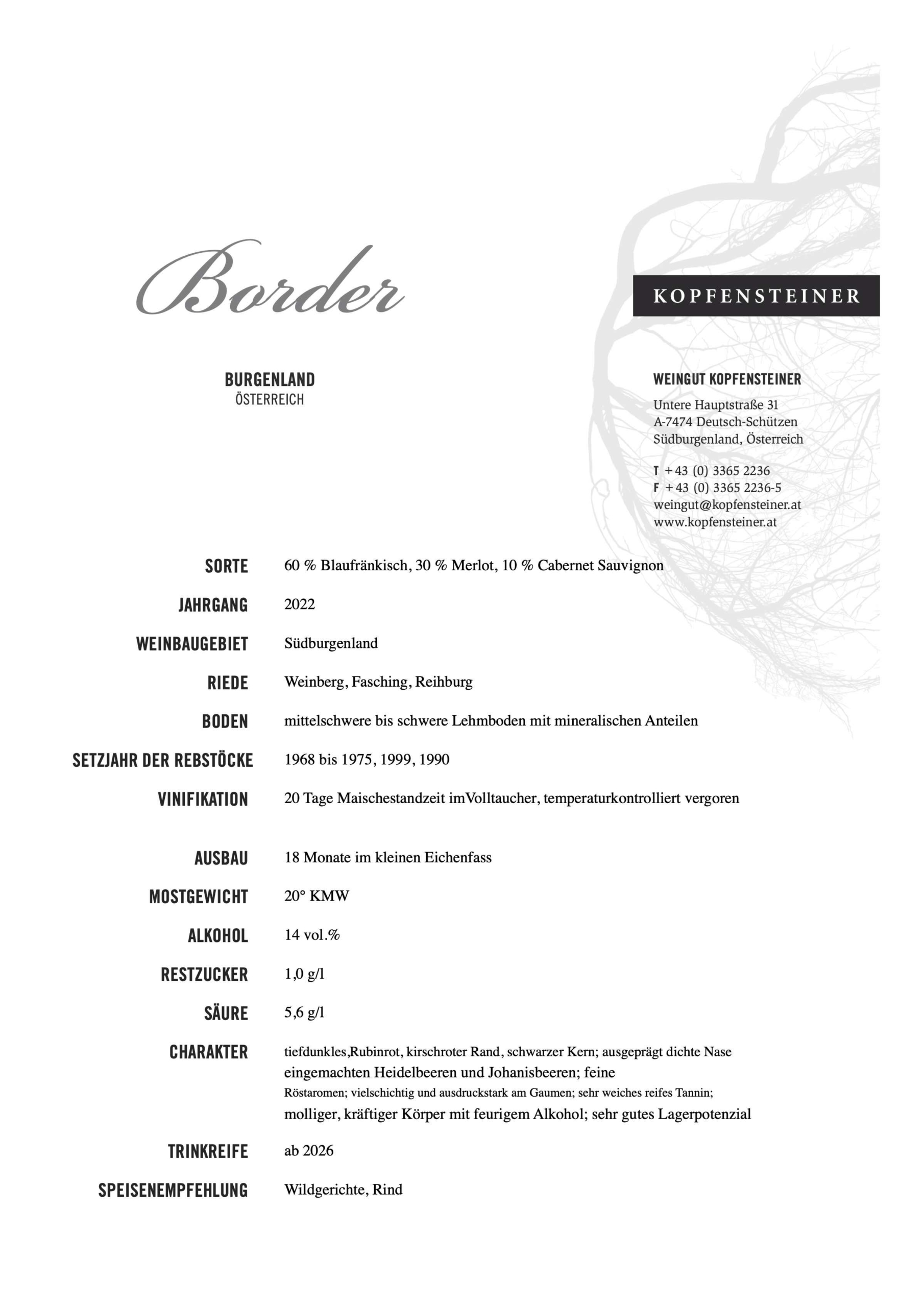 Der Border 2022 besticht mit seinem tiefdunklem Rubinrot, kirschrotem Rand und schwarzem Kern. Er besitzt eine ausgeprägt dichte Nase nach Rumtopf, eingemachte Heidelbeeren und Johannisbeeren sowie feine Röstaromen. Weiters ist der Border vielschichtig und ausdrucksstark am Gaumen. Gekennzeichnet durch einen mollig, kräftigen Körper mit feurigem Alkohol, hat der Border ein sehr gutes Lagerpotenzial.